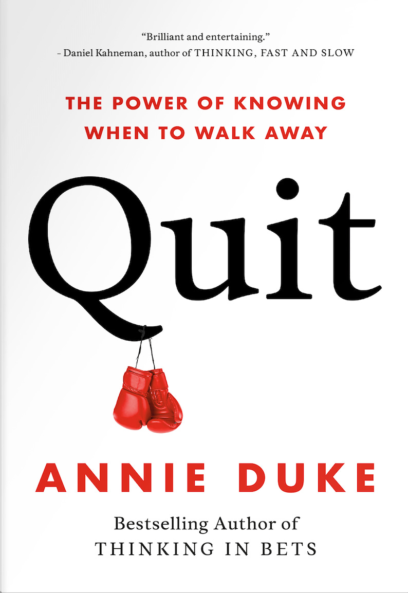 David Epstein: So Annie, your book has the bold word “QUIT” across the cover, with boxing gloves hanging from the “Q” — evocative of a boxer who throws in the towel rather than continuing to fight. I was just in an airport yesterday, and I must say, this imagery is pretty much the opposite of what I saw in the window displays of self-improvement books. How did you pitch this to your editor?