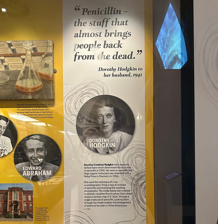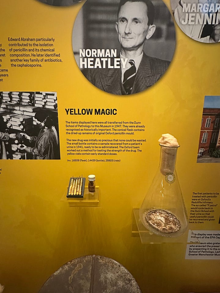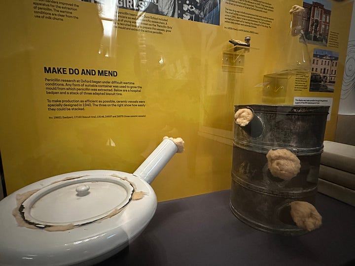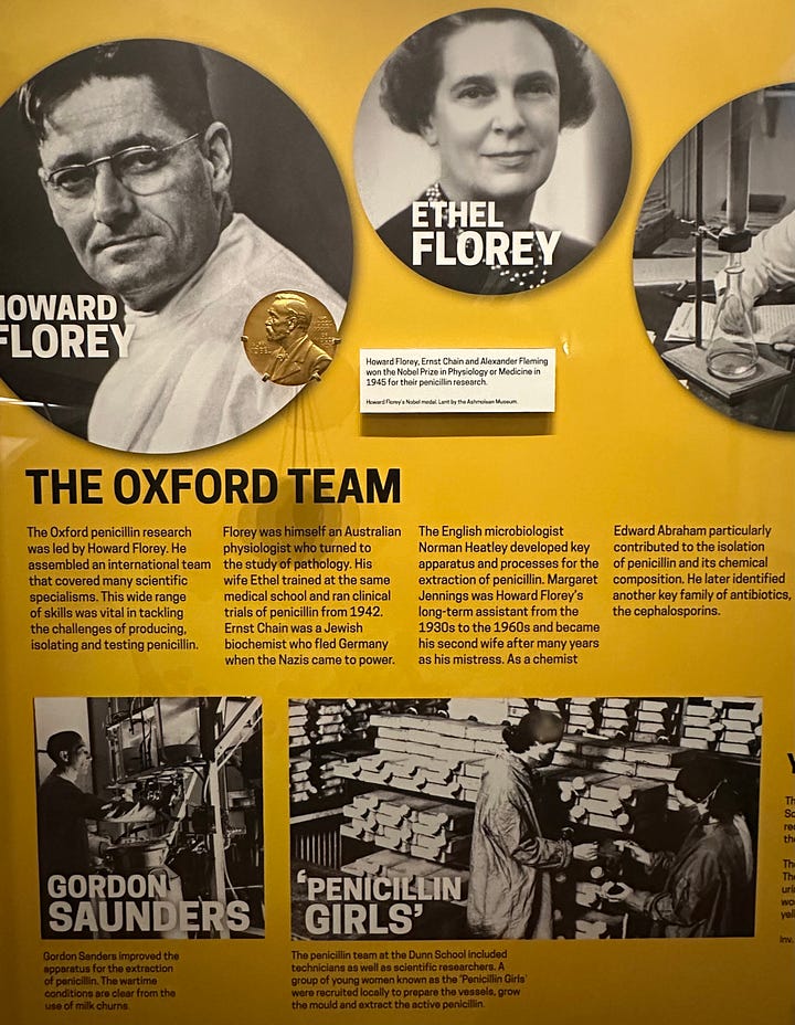 Since Derek mentioned penicillin and I happen to be in Oxford on a research trip this week, I popped over to the History of Science Museum. I checked out the exhibit on Oxford’s crucial role in transforming penicillin from a lab curiosity into a working treatment — a breakthrough that the U.S. government and American labs later scaled into mass production. Below are a few pictures of the exhibit. There was a tricky glare, but they should be readable if you zoom in.
