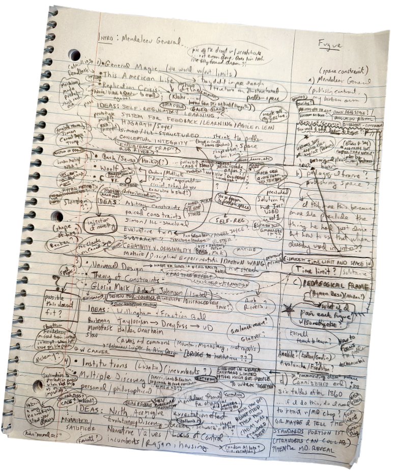 Obstacles, whether self-imposed or not, can be opportunities to clarify priorities and launch productive exploration. The one-page outline forced both for me. I had to prioritize ideas ruthlessly. And I had to experiment with a new structure that could make it all work.