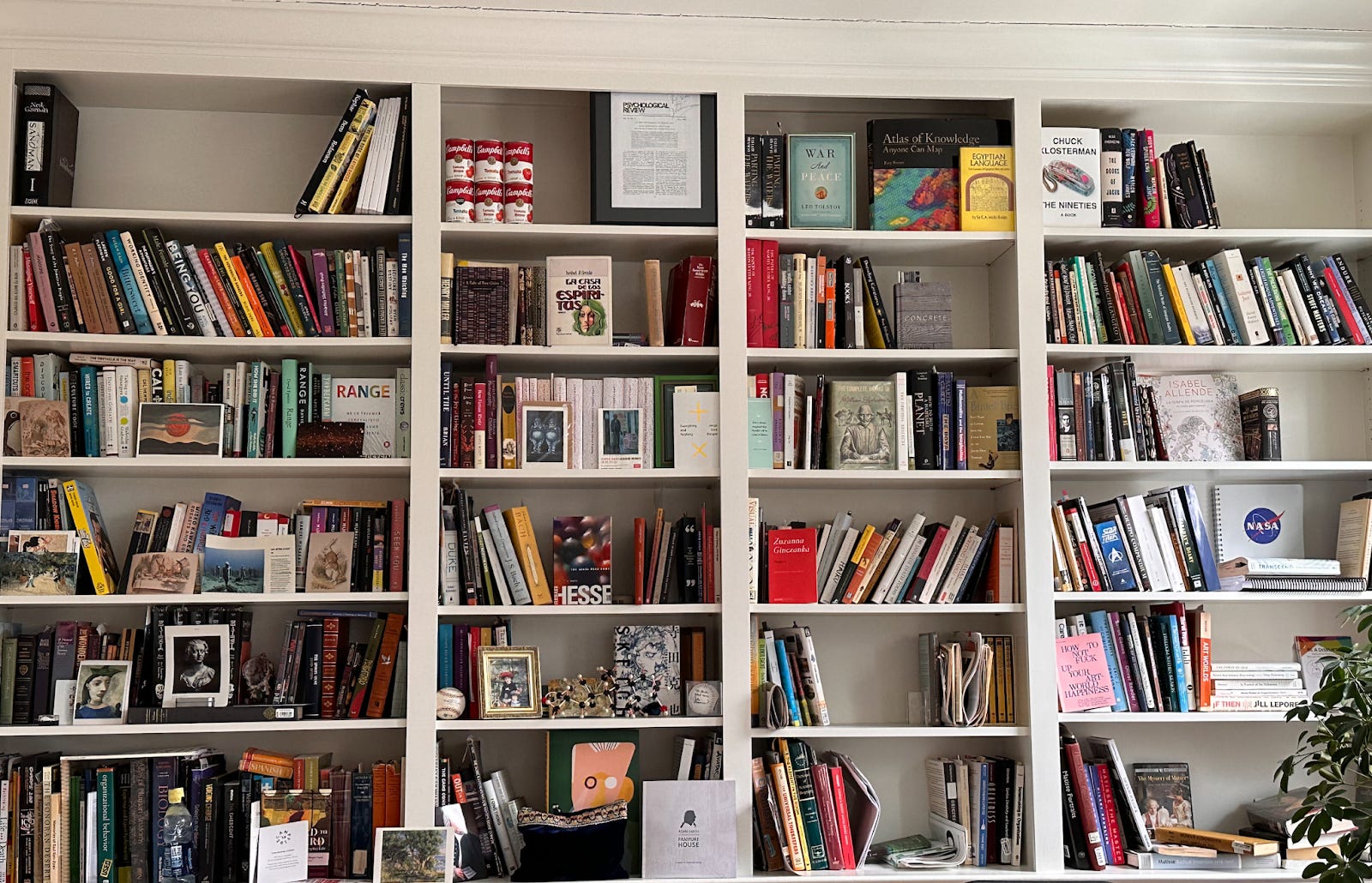 DE: And this isn’t a question, but just an ending. You write that it’s important to try to “match your space to your work,” like Lin-Manuel Miranda when he got permission to work in the house that served as George Washington’s headquarters during the Battle of Harlem, so he could commune with history as he composed Hamilton. Again, that’s extreme, but you point out more pedestrian examples. And since I’m in book-writing mode, I sometimes turn out books on the shelves beyond my desk to give me inspiration. (This presently includes one of my own, as a reminder that I’ve actually finished a book before, because right now it feels impossibly far away.) So I just wanted to finish with a shot of my view at this moment. And you might find yourself in there above Murakami!